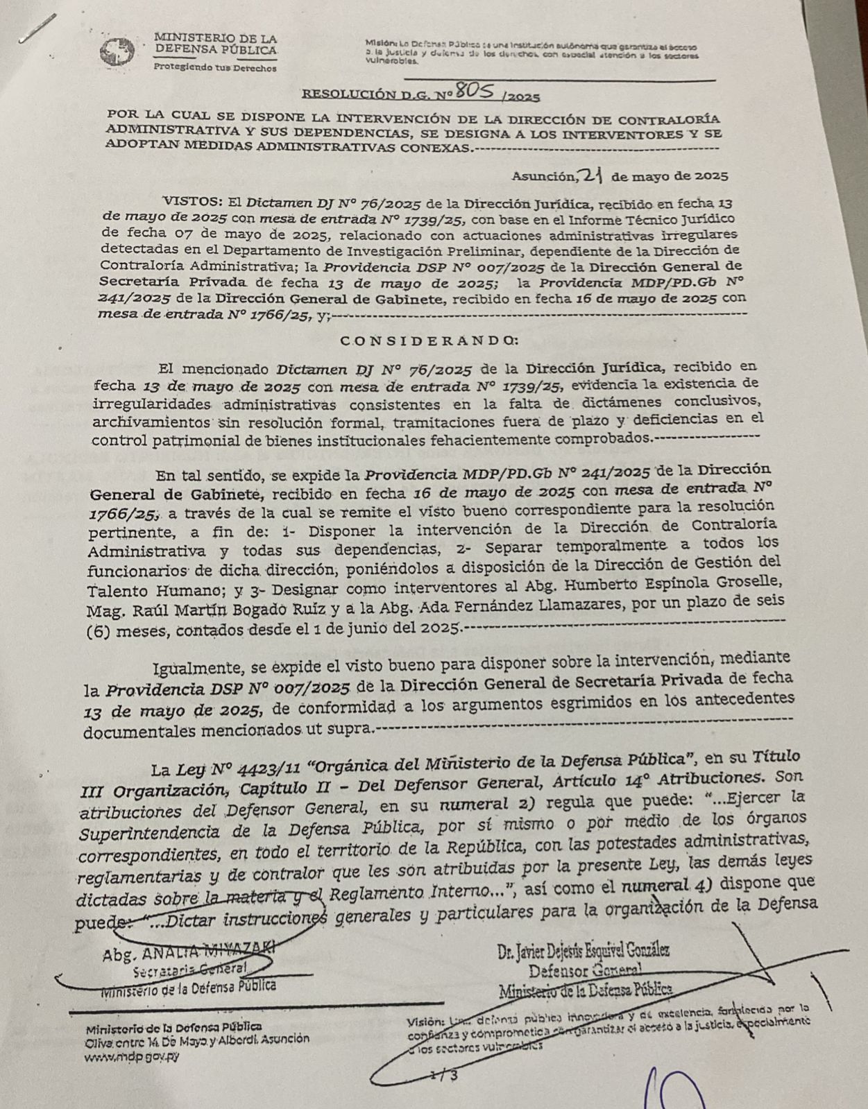 Funcionarios de la Dirección de Contraloría Administrativa del Ministerio de la Defensa Pública denuncian haber sido víctimas de represalias y una «cacería de brujas», tras iniciar una investigación contra la directora jurídica de la institución, Silvia Bogado Armoa, cercana a la esposa del ministro Javier de Jesús Esquivel.