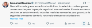 En una declaración publicada en su cuenta oficial de X a las 09:11 horas, el mandatario francés enfatizó que «la escalada actual es peligrosa para todos. Debe cesar», marcando una postura firme de París frente a la creciente tensión en Oriente Medio.