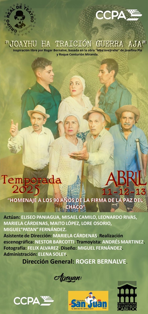 El Grupo Real de Teatro (1979-2025), estrena este 11 de abril a las 20:30 horas la obra “Joayhu ha Traición Guerra Aja” en homenaje a los 90 años de la firma de la Paz del Chaco (1935-2025). Esta obra estará en cartelera los días 11, 12 y 13 de abril en los siguientes horarios: viernes y sábado a las 20:30 horas y domingo a las 20:00 horas, en el Teatro de las Américas del CCPA (José Berges entre Estados Unidos y Brasil). Las entradas tienen un costo de Gs. 50.000 para público en general y Gs. 30.000 para estudiantes.
